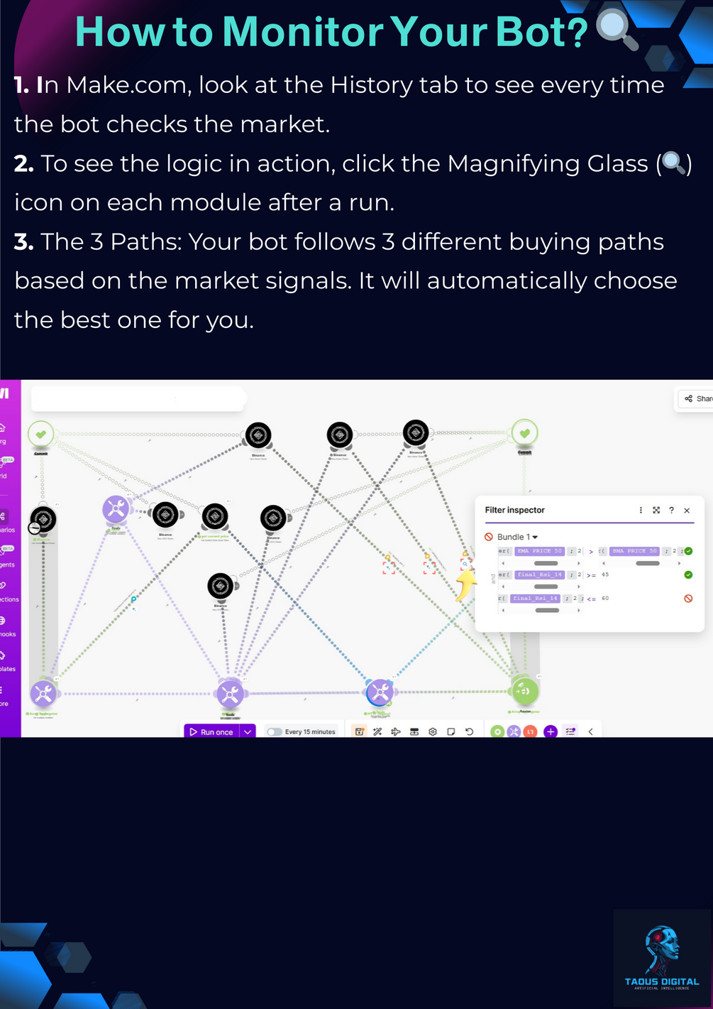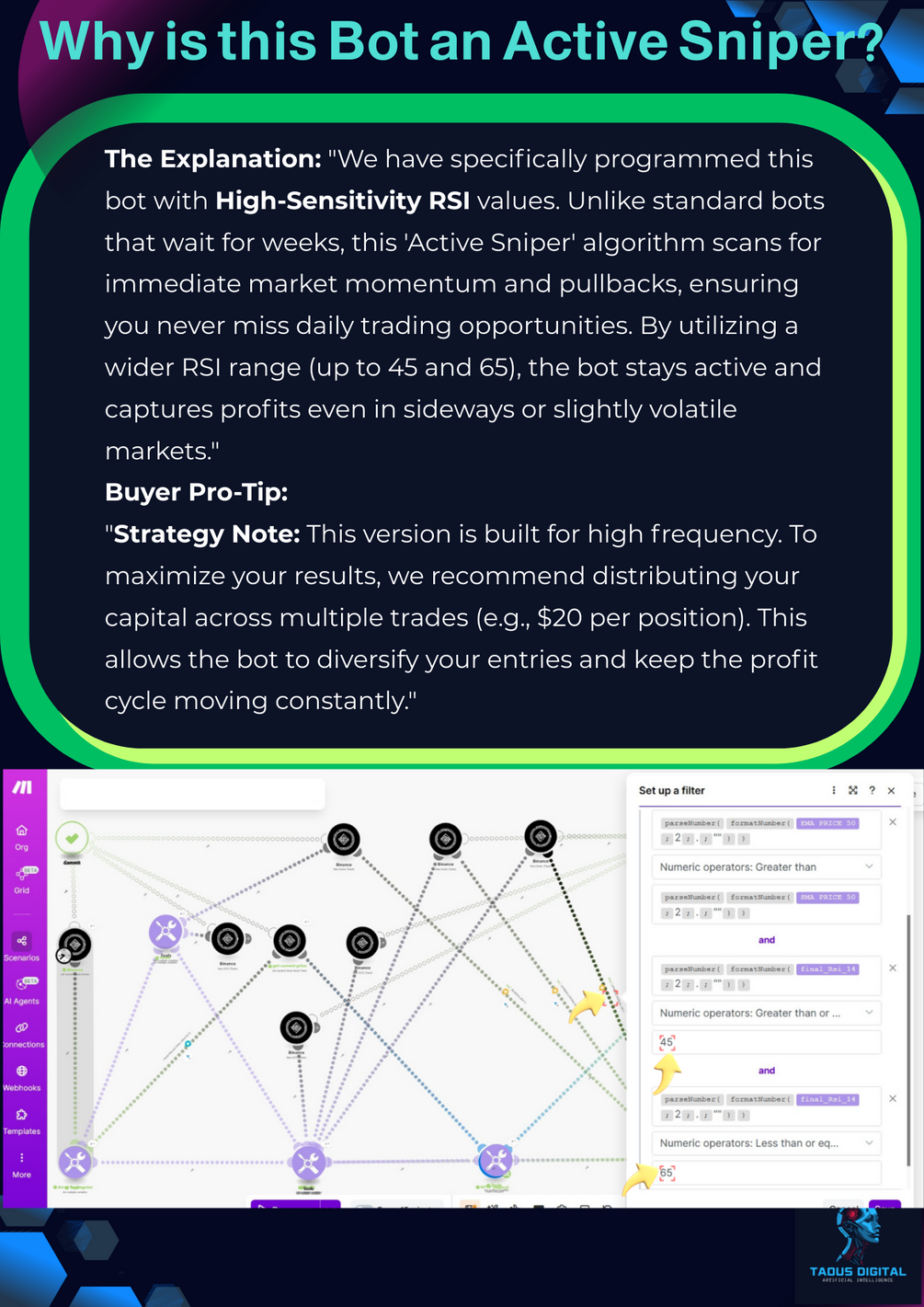 Introducing the Taous Digital - Standard Edition Blueprint. This is not just a bot; it’s a high-precision trading logic built on Make.com, designed to connect directly to your Binance account.
